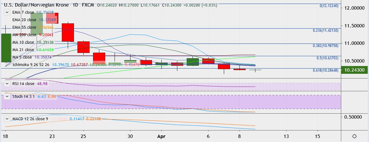 - USD/NOK trades flat at 10.2964, having touched a low of 10.1243 on Tuesday, its lowest March 16.