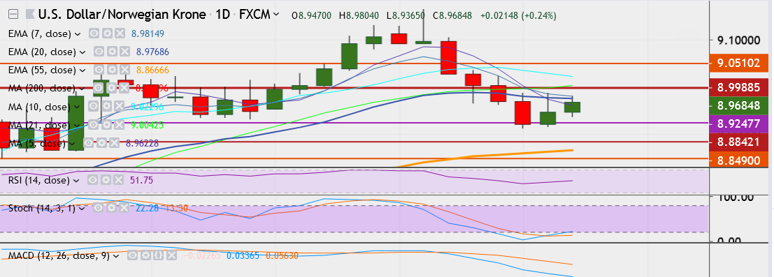- USD/NOK trades 0.2 percent up at 8.9679, having touched a low of 8.9122 on Monday, its lowest since Aug. 14.
