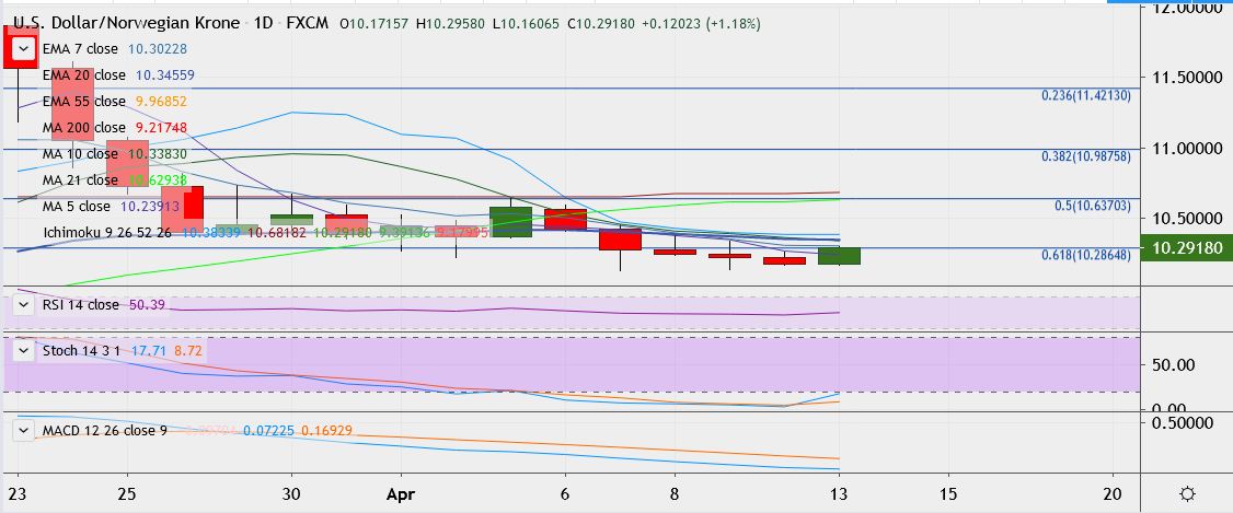 - USD/NOK trades 1.2 percent up at 10.2917, having touched a low of 10.1243 on Tuesday, its lowest March 16.