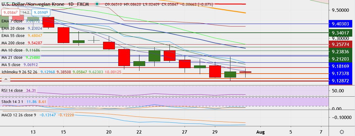 - USD/NOK trades 0.1 down at 9.0580, having touched a low of 9.0013 on Thursday, its lowest since Jan 27.