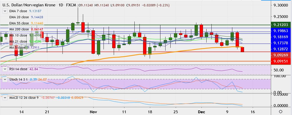 - USD/NOK trades 0.2 percent lower at 9.0927, having touched a low of 9.0910 earlier, its lowest since November 18.