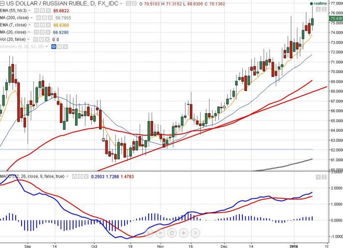 USD/RUB has reached year high around 76.47 and slightly retreats from that level. Russian ruble lost 40% of its value last year and now 25% down compared to year ago.