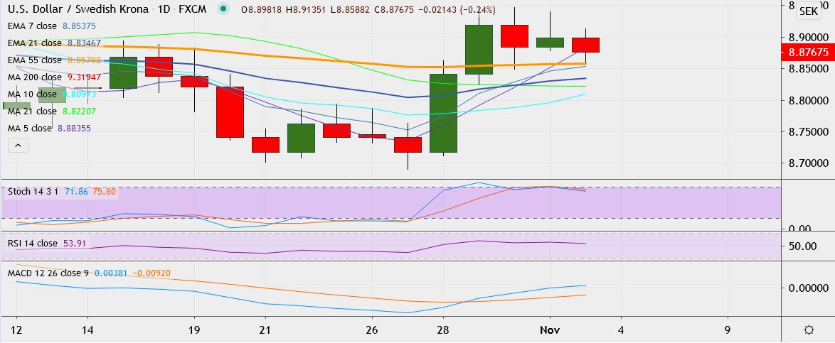 - USD/SEK trades 0.3 percent lower at 8.8735, having hit a high of 8.9484 on Thursday, its highest since October 7.