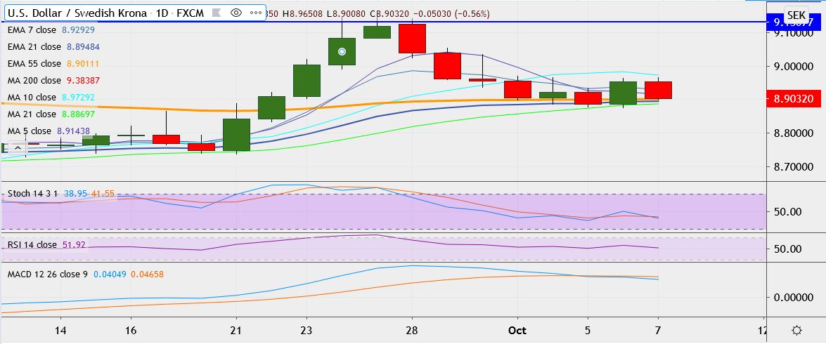 - USD/SEK trades 0.5 percent lower at 8.9085, having hit a low of 8.8758 the day before, its lowest since September 22.