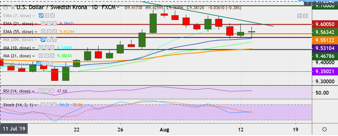 - Immediate resistance is located at 9.6130 (trendline joining 9.7000 and 9.6427), close above could take it near 9.6512 /9.7000 (August 1 High).