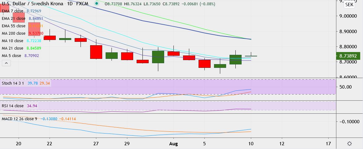 - USD/SEK trades 0.05 percent higher at 8.7431, having hit a high of 8.7758 on Friday, its highest since August 4.