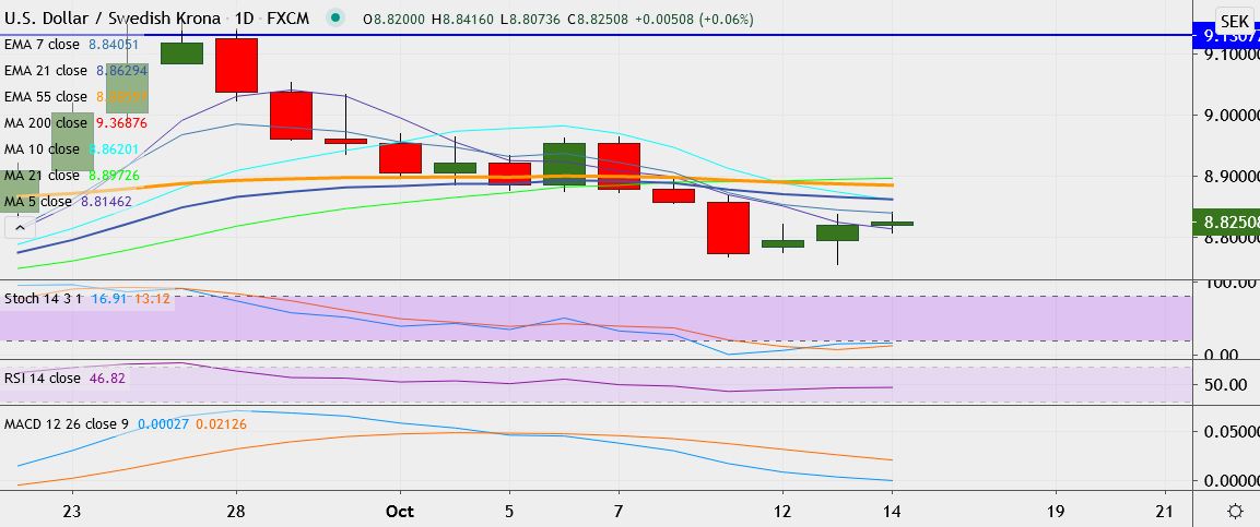 - USD/SEK trades 0.05 percent higher at 8.8241, having hit a low of 8.7559 on Tuesday, its lowest since September 22.