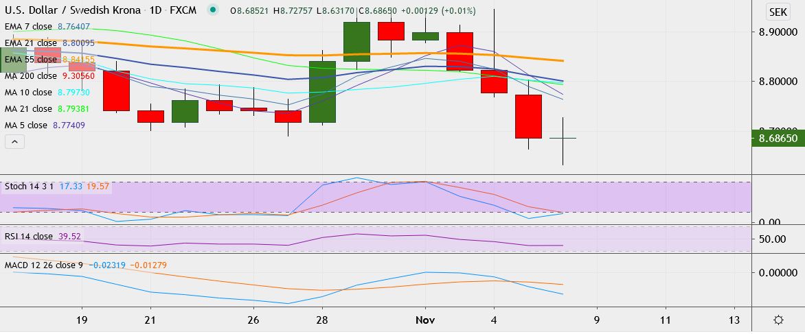 - USD/SEK trades flat at 8.6854, having hit a low of 8.6317 earlier, its lowest since September 1.