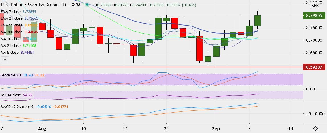 - USD/SEK trades 0.5 percent higher at 8.8029, having hit a high of 8.8175 earlier, its highest since July 27.