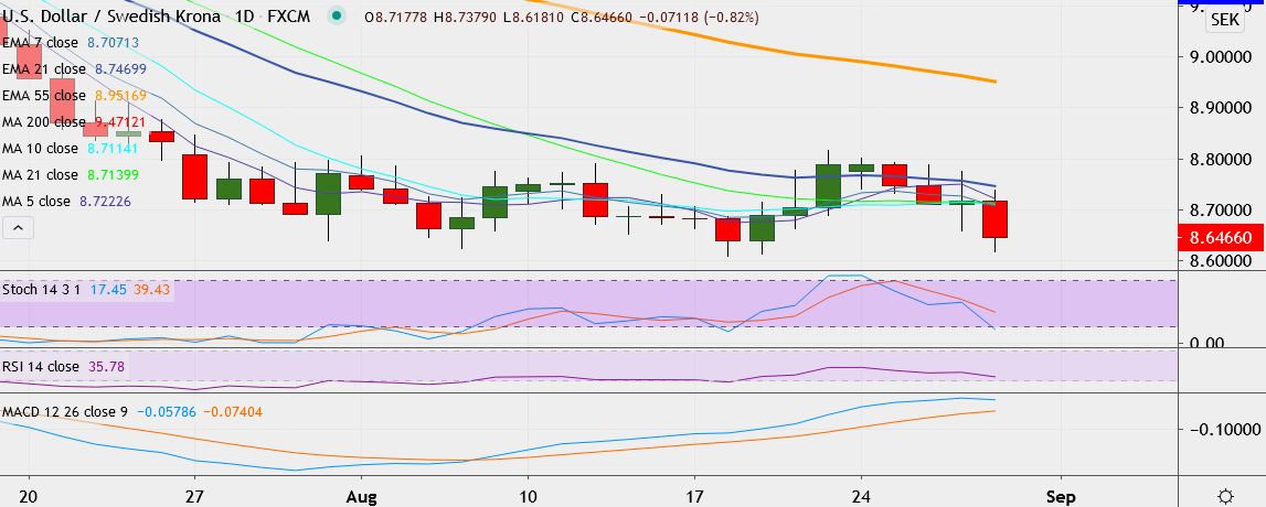- USD/SEK trades 0.8 percent lower at 8.6492, having hit a low of 8.6191 earlier, its lowest since August 19.