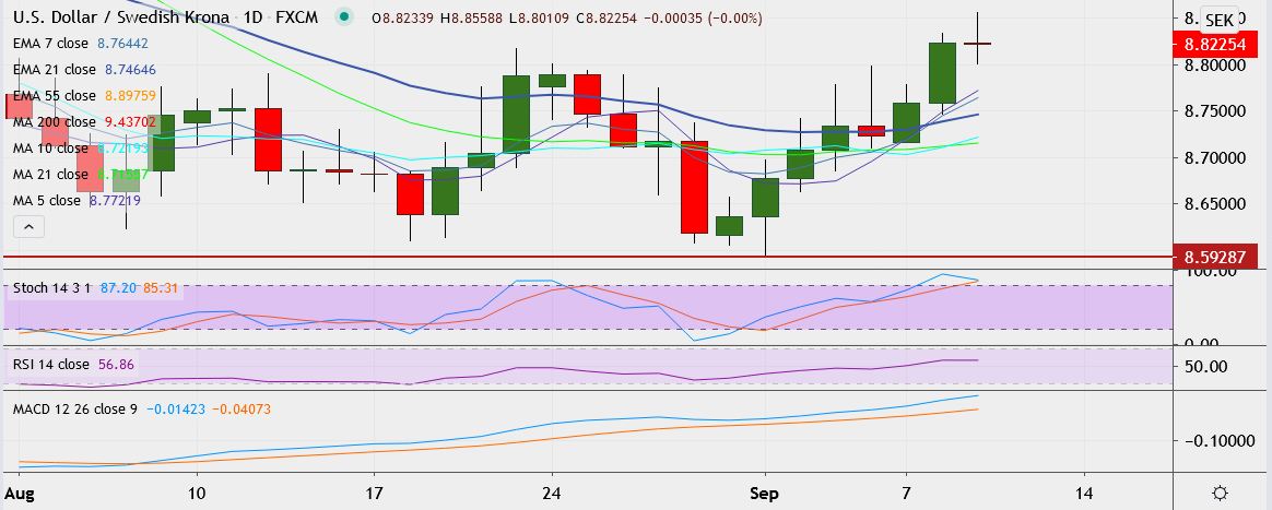 - USD/SEK trades 0.05 percent higher at 8.8240, having hit a high of 8.8558 earlier, its highest since July 24.