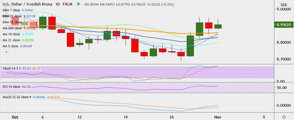 - On the lower side, support is seen at 8.8558 (55-EMA), break below could take it till 8.8237 (21-EMA).