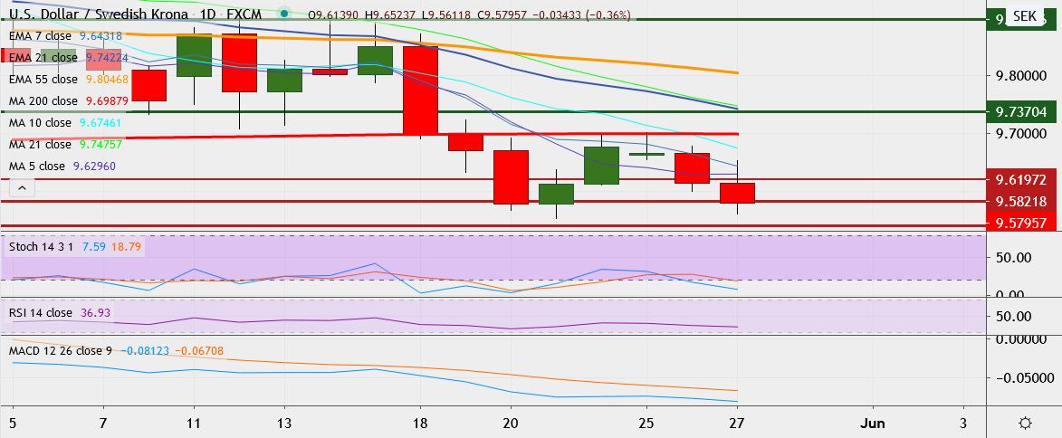 - USD/SEK trades 0.3 percent down at 9.5786, having hit a low of 9.5611 earlier, its lowest since May 21.