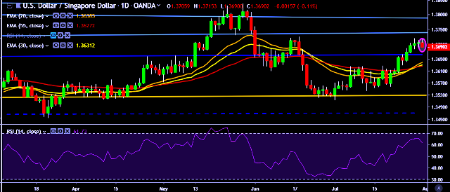 - USD/SGD is currently trading around 1.3691 marks.