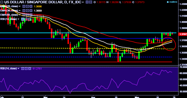 We prefer to take short position in USD/SGD around 1.38, stop loss 1.3841 and target 1.3772/ 1.3628 marks.