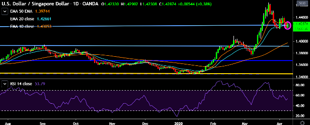 We prefer to take long position on USD/SGD only above 1.4290, stop loss at 1.4220 and target of 1.4360/1.44.