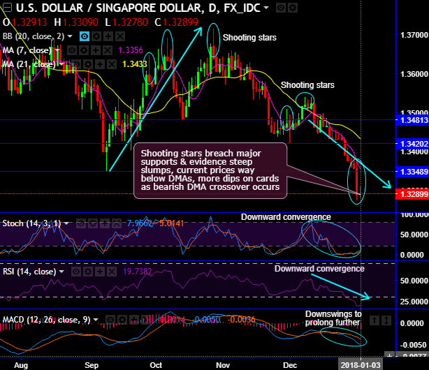 Shooting stars have formed on daily plotting at 1.3519, 1.3523 and 1.3464 levels that nudge the prices below DMAs, these bearish patterns have managed to breach major supports & evidence steep slumps.
