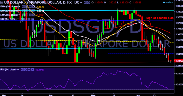 We prefer to take short position in USD/SGD only below 1.3357, stop loss 1.3437 and target 1.3271 marks.