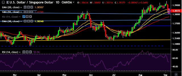 - USD/SGD is currently trading around 1.3837 marks.
