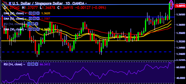 We prefer to take long position on USD/SGD only above 1.3707, stop loss at 1.3650 and target of 1.3768.