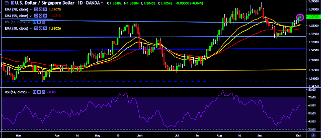 We prefer to take long position on USD/SGD around 1.3850, stop loss at 1.3820 and target of 1.3913.