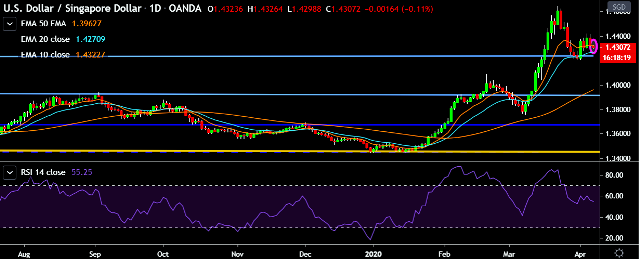- USD/SGD is currently trading around 1.4308 marks.