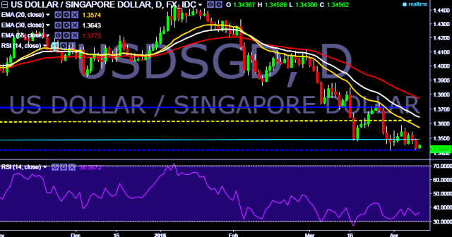 We prefer to take long position in USD/SGD around 1.3450, stop loss 1.3423 and target 1.3502/1.3628 marks.