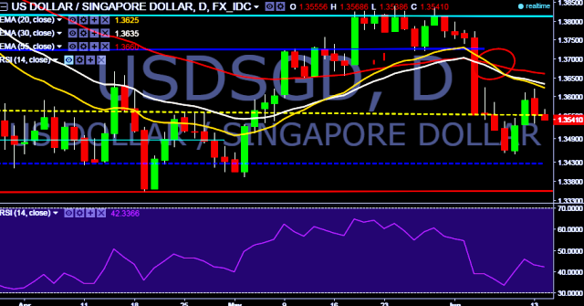 We prefer to take short position in USD/SGD at 1.3560, stop loss 1.3622 and target 1.3460/ 1.3422 marks.