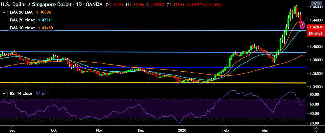 - USD/SGD is currently trading around 1.4288 marks.