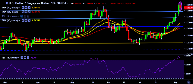 We prefer to take short position on USD/SGD around 1.3830, stop loss at 1.3870 and target of 1.3754.