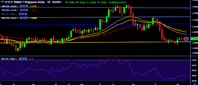 We prefer to take long position on USD/SGD only above 1.3575, stop loss at 1.3550 and target of 1.3632/1.3680.