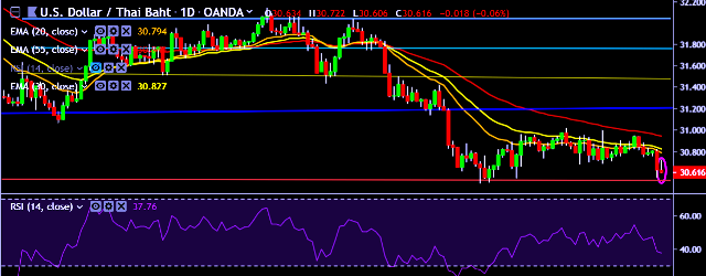 We prefer to go short on USD/THB around 30.64, stop loss at 30.80 and target of 30.56/30.42 mark.