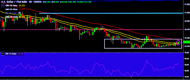 We prefer to go long on USD/THB around 30.27, stop loss at 30.16 and target of 30.43/30.72.