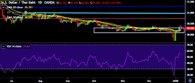 We prefer to go long on USD/THB around 30.28, stop loss at 30.15 and target of 30.43/30.72.
