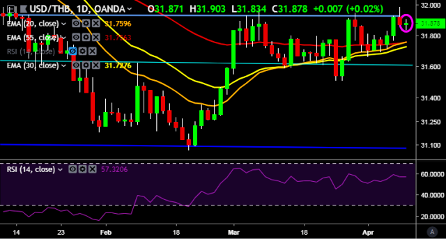 We prefer to take long position on USD/THB only above 31.92, stop loss 31.80 and target of 32.02/32.10.