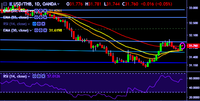 We prefer to take long position on USD/THB only above 31.78, stop loss 31.70 and target of 31.92/32.02 mark.