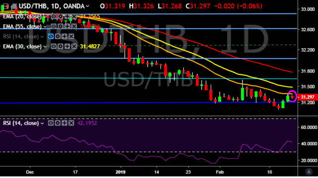We prefer to take long position on USD/THB only above 31.35, stop loss at 31.20 and target of 31.44/31.62 mark.