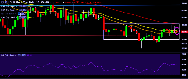 We prefer to go long on USD/THB only above 30.72, stop loss at 30.55 and target of 30.97/31.08/31.20.