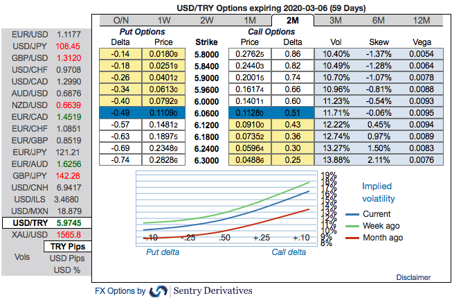It seems that hedgers of TRY are positioned for the upside risks on the above fundamental factors. The positively skewed IVs of 2m tenors are bidding for OTM calls strikes up to 6.30 levels (refer 1st chart).