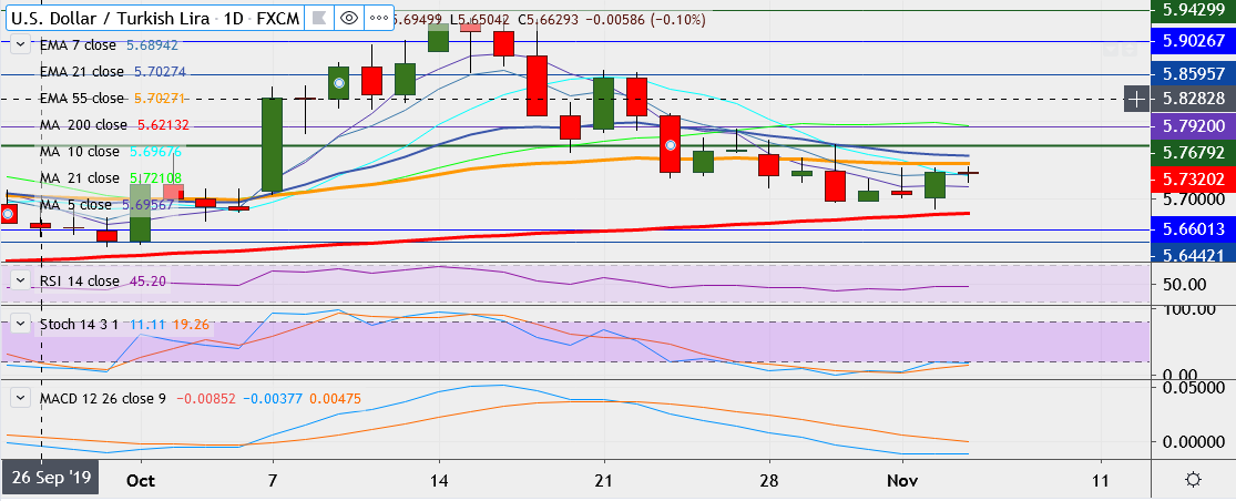 - Immediate resistance level is located at 5.7456 (55-EMA)/ 5.7570 (21-DMA), any close above could take it above 5.7701.