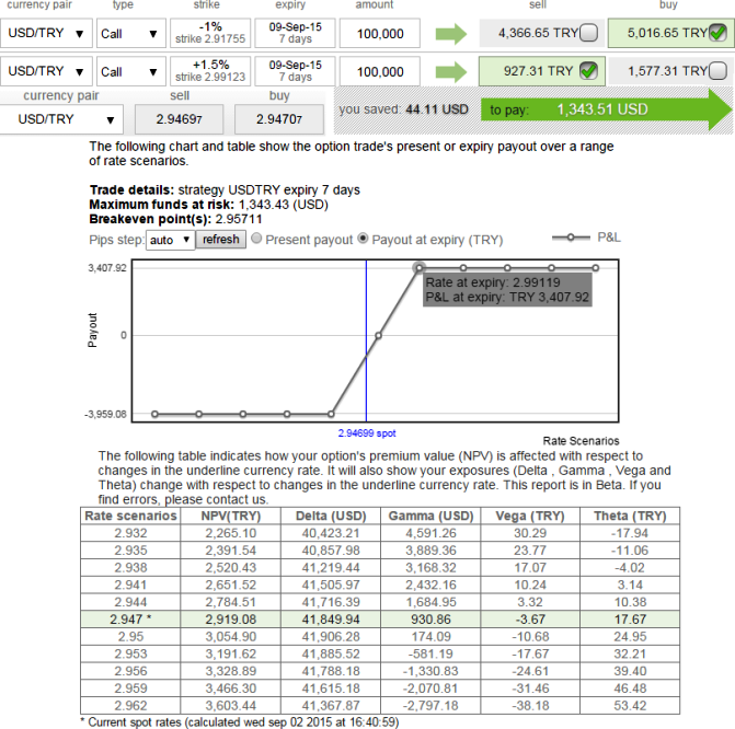 Why this call spread: As explained in our recent post, a short term correction is expected on this pair and because of this expectation, with a view of swing trading an OTM call shorting is advised. An investor often employs the bull call spread in moderately bullish market environments, and wants to capitalize on a modest advance in price of the underlying asset. If the investor's opinion is very bullish on USDTRY, it will generally prove more profitable to make a simple call purchase.