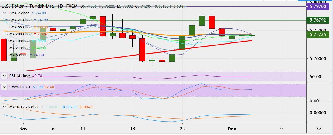 - On the downside, support is seen at 5.7347 (10-DMA), and break below could take it near 5.7297 (200-DMA).