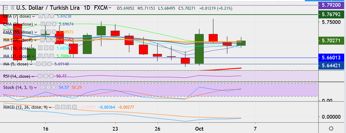 - USD/TRY is currently trading 0.2 percent up at 5.7013, having hit a high of 5.7576 on Wednesday, its highest since September 12.