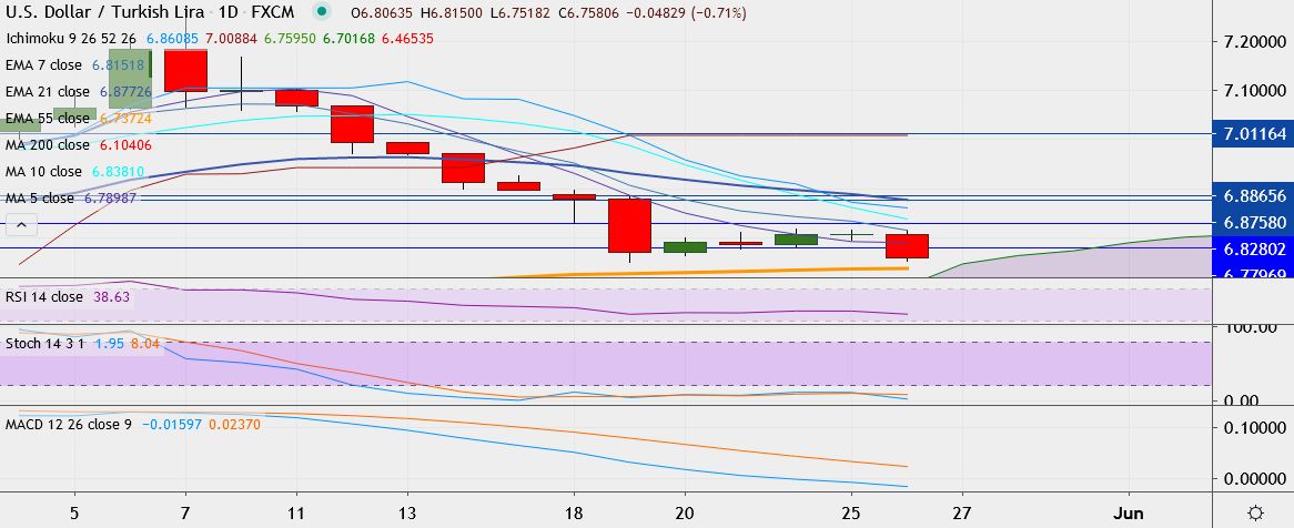 - USD/TRY is trading 0.6 percent lower at 6.7613, having hit a low of 6.7518 earlier, its lowest since May 19.