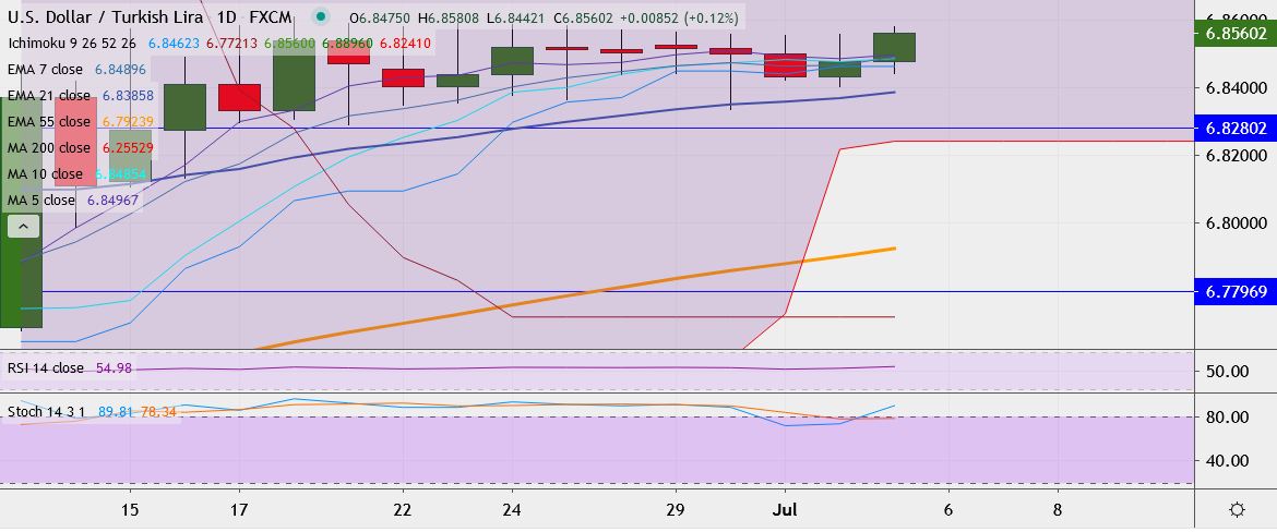 - USD/TRY is trading 0.1 percent up at 6.8551, having hit a high of 6.8580 earlier, its highest since June 18.