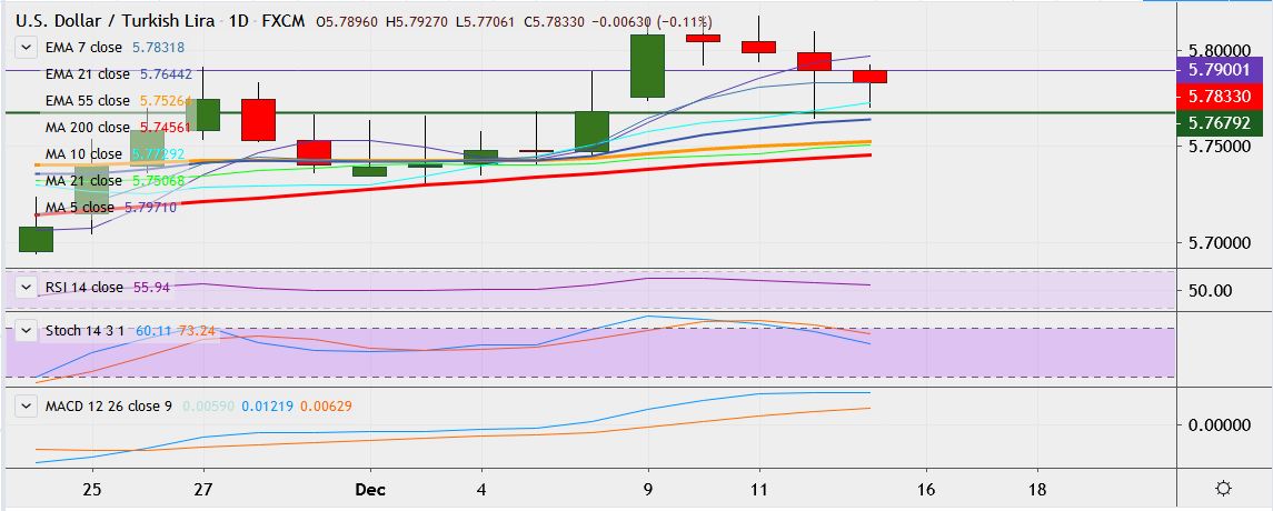 - On the downside, support is seen at 5.7625 (21-EMA). and break below could take it near 5.7515 (55-EMA).