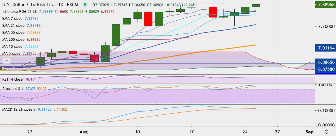FxWirePro: USD/TRY hovers towards record peaks, likely to break above 7.4000