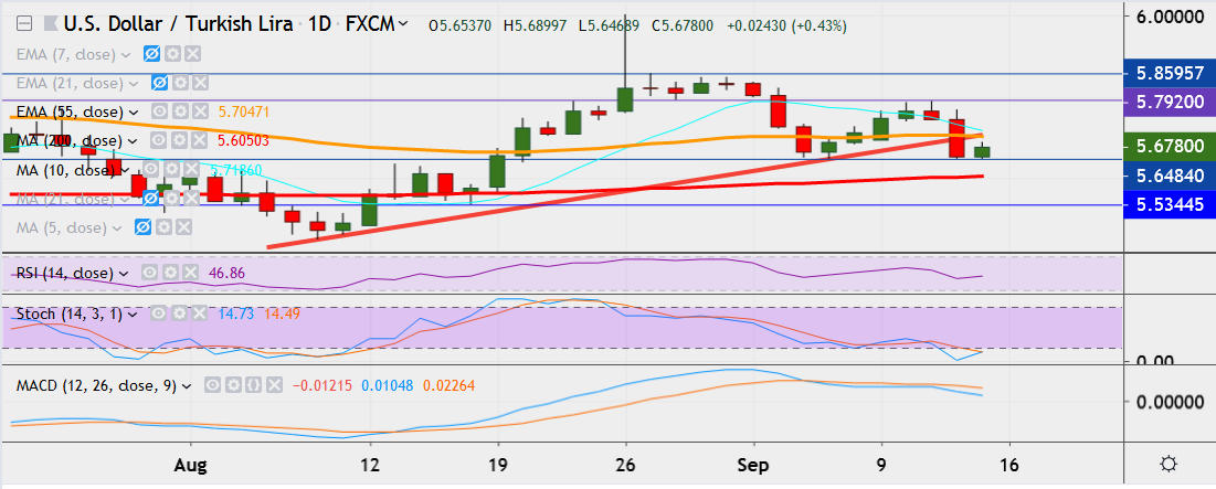 - Immediate resistance is located at 5.7057 (55-DMA) / 5.7339 (10-DMA), break above could take it till 5.7913 (September 11 High).