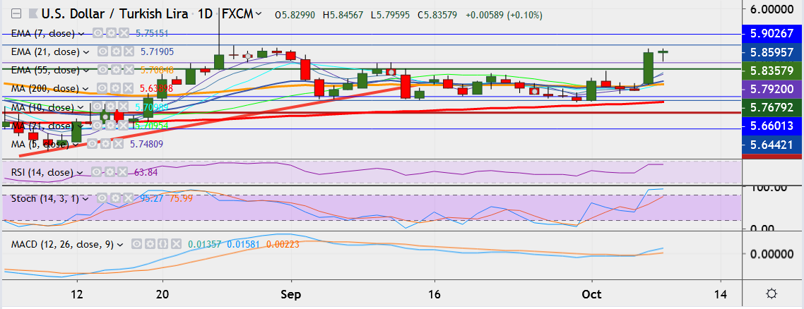 - USD/TRY is currently trading 0.1 percent up at 5.8391, having hit a high of 5.8456 earlier, its highest since August 30.