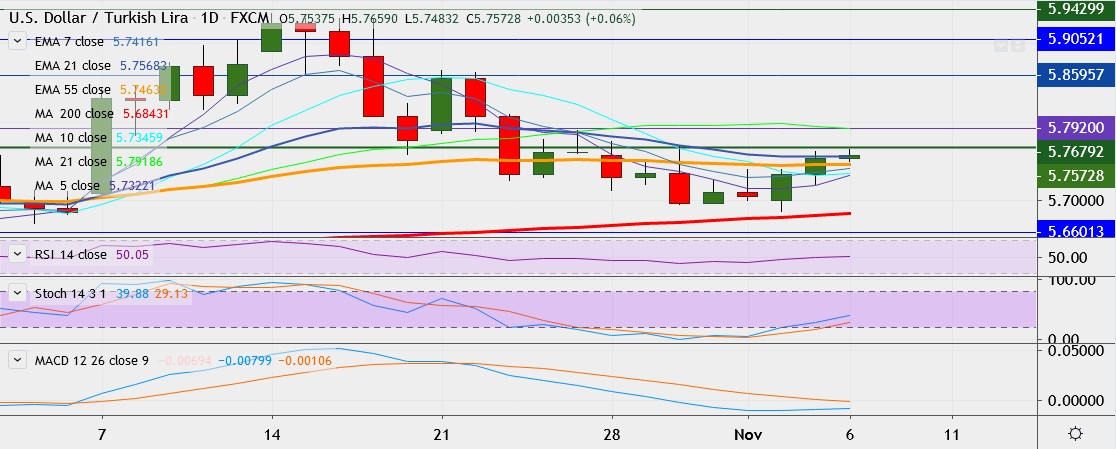 - USD/TRY is currently trading 0.1 percent up at 5.7575, having hit a low of 5.6852 on Monday, its lowest since October 4.